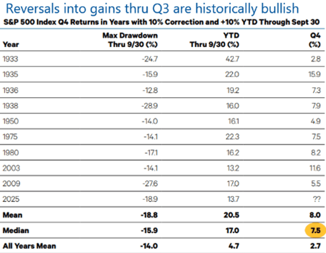 Since 1942, 20% drawdowns have occurred about every five and a half years. This decade has already seen three. Right tails arise just as often, and compounding depends on capturing them. The S&P 500 was up more than 30% from April lows, marking one of the best five-month runs in history. Forward returns after such surges have historically been positive across 6– 12-month horizons. Further, when the S&P 500 index has rebounded from a 10% correction to gain at least 10% through Q3, it has often carried that momentum through year-end (2).