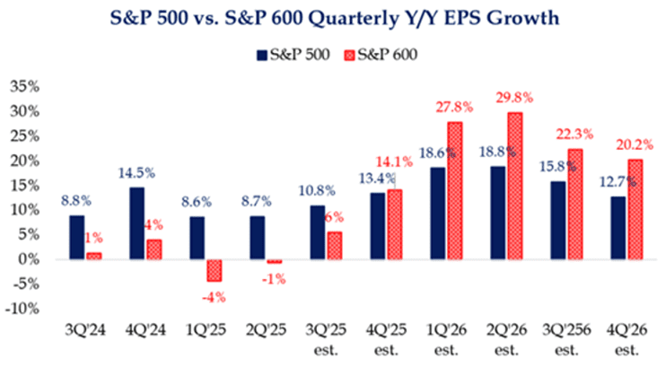 Within small caps, investors have been focused on elevated interest expense and persistent profitability challenges. However, with interest rates coming down and expected to fall further in 2026, it was notable that the earnings outlook for small caps in 2026 shifted meaningfully. The Fed’s Summary of Economic Projections anticipates two future drops as of the September meeting. Part of this improvement could be attributed to easier year-over-year comparisons; it’s also the first time in years that we have seen a sustained and meaningful earnings growth outlook for small caps (see chart (3)).